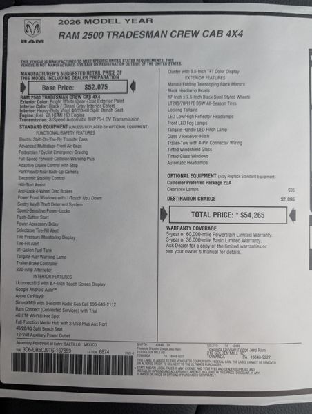New 2026 RAM 2500 Tradesman Crew Cab 4x4 6'4' Box